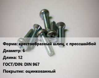Винт крестообразный шлиц, с прессшайбой 6х12 DIN 967 оцинкованный
