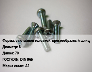 Винт с потайной головкой, крестообразный шлиц 8х70 DIN 965 Сталь: А2, цена за шт, кг цена от 5.4 Тг / кг, где купить, условия доставки в Караганде и Карагандинской области