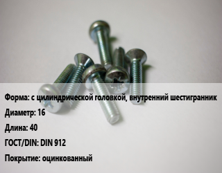 Винт с цилиндрической головкой, внутренний шестигранник 16х40 DIN 912 оцинкованный